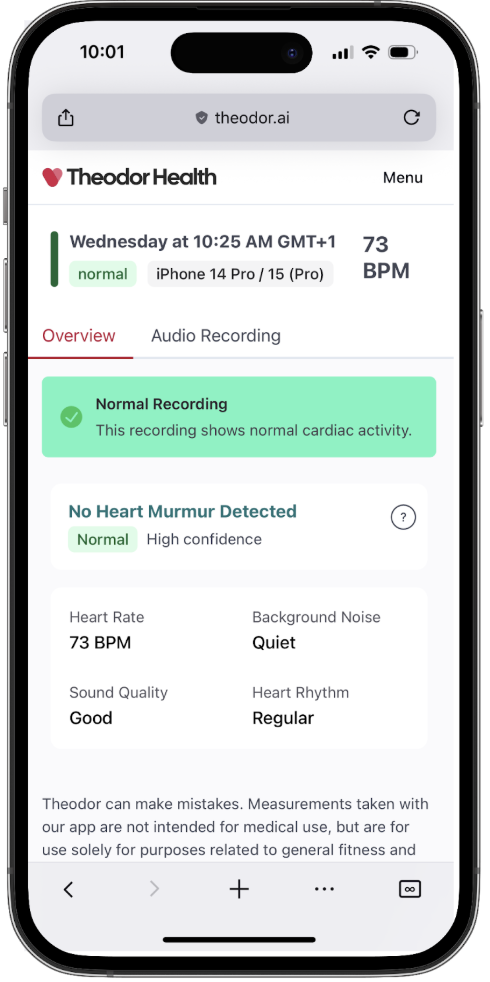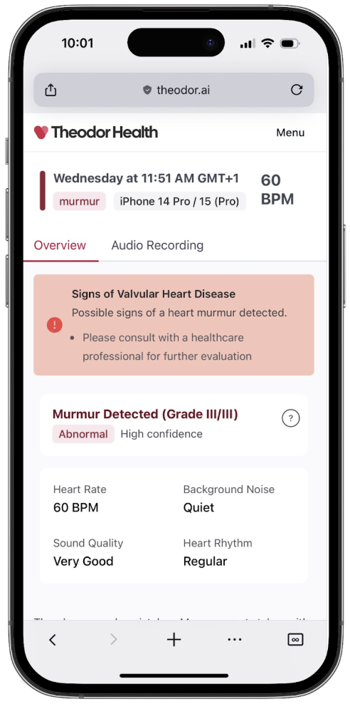 Theodor Health erkennt Herzgeräusche, Anzeichen von Vorhofflimmern, Bradykardie, Tachykardie und pathologische Lungengeräusche in Sekundenschnelle.
